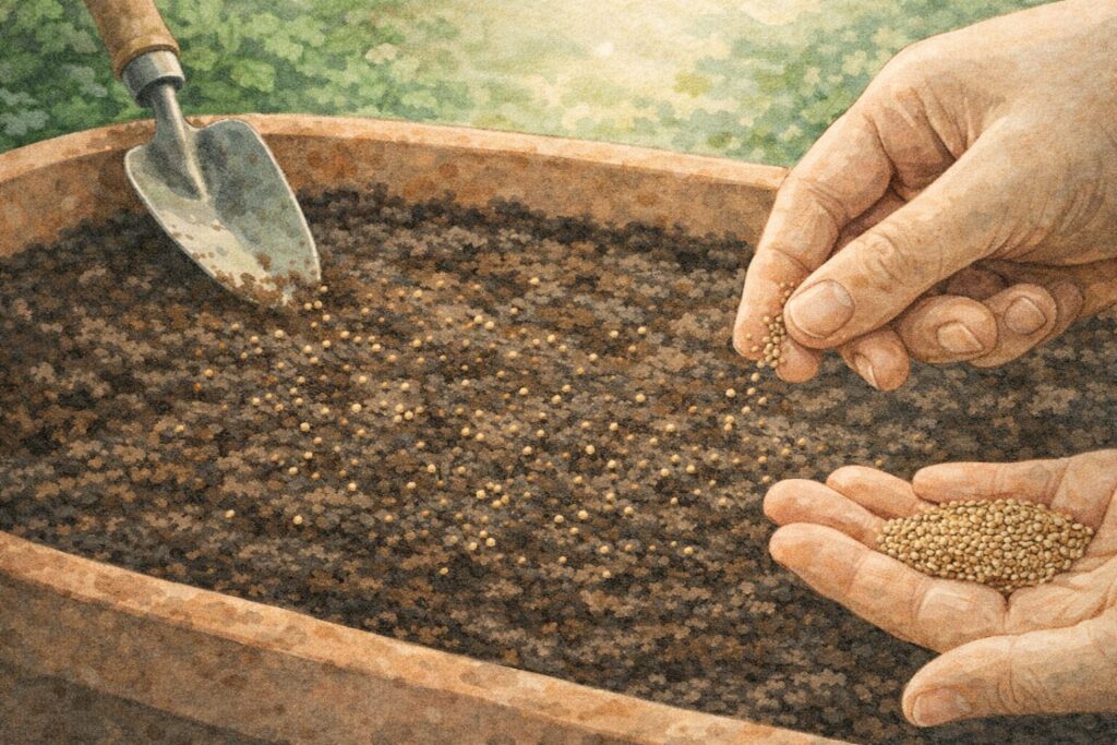 プランターに土を詰め、表面に種をパラパラとまきましょう。