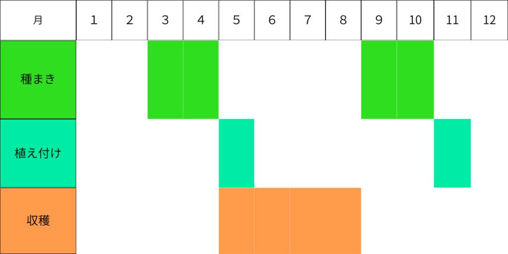 いつ植えても秋前に枯れてしまうので、秋植えのほうが収穫時期を長く取れます。