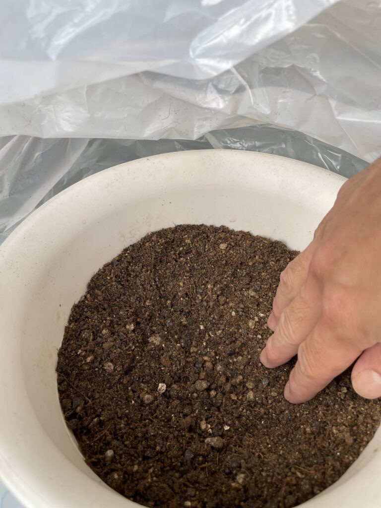 土が散らかって汚れるのを防ぐため、ごみ袋などの大きな袋の中で作業していきます。