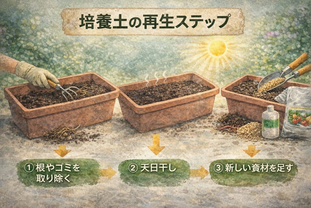 市販の培養土も、自分で配合した土も、使い方次第で再利用は可能ですが、