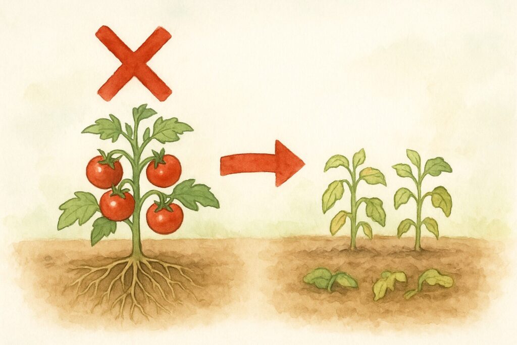 | ナス科 | ナス、トマト、ピーマン、じゃがいも | 連作障害が強く出やすい |
